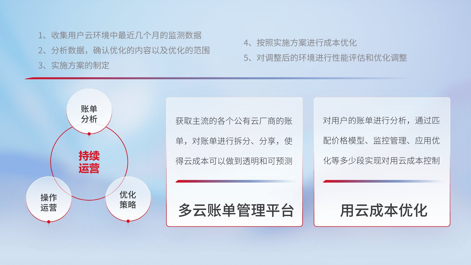 通过多云纳管,,,以统一的资源数据模型把客户的云资源进行抽象和封装,,进而实现对多云资源的统一操作,,保障云资源管理的可靠性、、稳定性与可用性。。。。量身定制化运维内容,,,,配置、、、开发运维、、补丁管理、、备份、、、监控、、认证和访问管理、、、审计和日常巡检等,,,保障在用云过程中的可靠度,,稳定度以及高可用率。。。。
