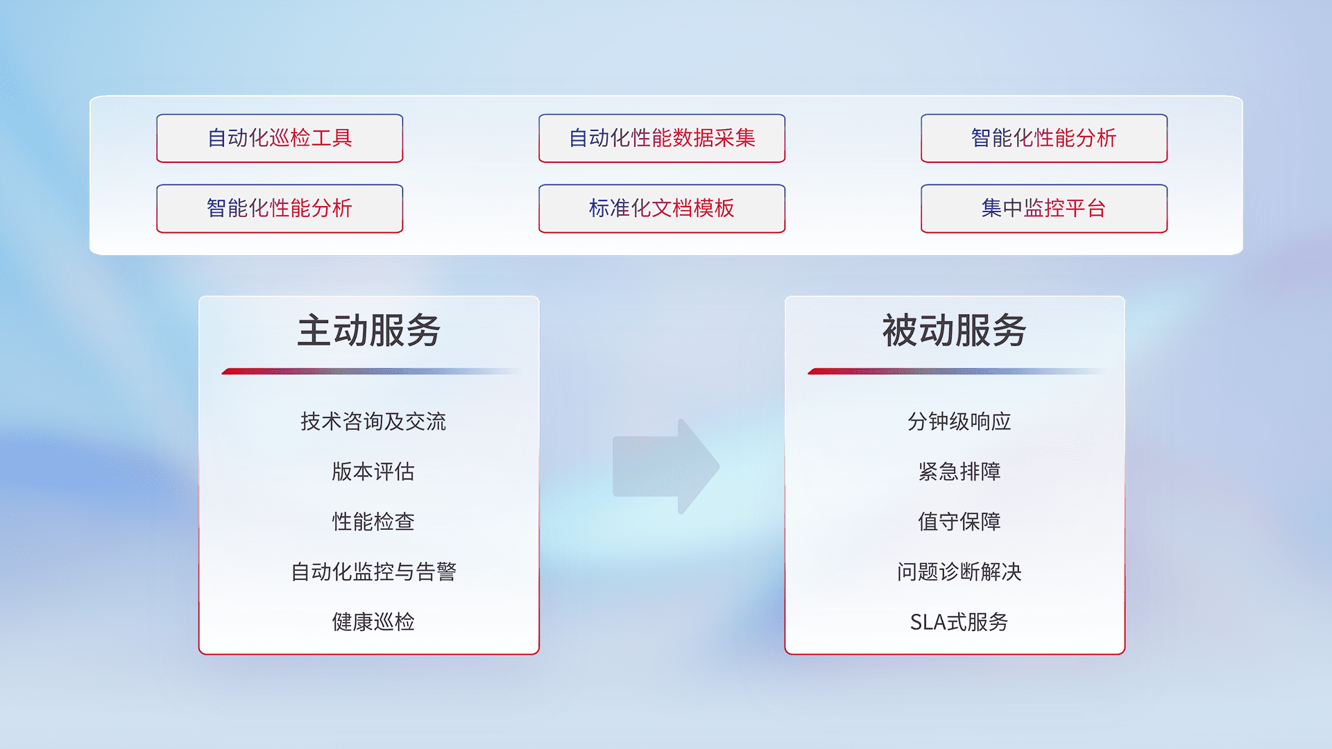 智能化工具和标准化文档,,保障服务质量,,,,提供主动服务(包含技术咨询、、、、版本评估、、性能检查、、、自动化监控与告警、、、健康巡检)和被动服务包含(分钟级响应、、、紧急排障、、、值守保障、、问题诊断解决、、SLA服务)。。